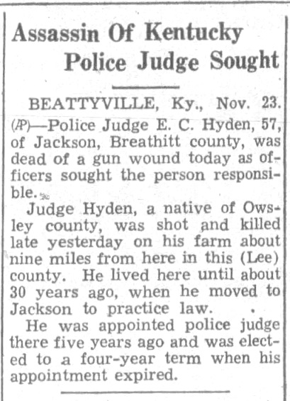 A little after 3:00 p.m., Hyden’s renter, 27-year-old Arthur Marshall, told him he could not pay and started screaming at the Judge. A verbal argument ensued over the rent and the division of some “farm goods and corn.” Driver Johnny Mullins, an eyewitness to the events, reported that Judge Hyden turned to go to the car when Mullins pointed a pistol at Hyden’s head and pulled the trigger. Marshall then reportedly fired a second shot into Hyden’s left side. At least two shots struck Hyden, and he died within a few minutes. Later reports and testimony indicated that three shots may have been fired, and Marshall claimed that Hyden advanced on him with a knife. No knife was located at the scene. In March 1939, a Lee County jury convicted Marshall and sentenced him to 15 years in the Kentucky State Penitentiary.