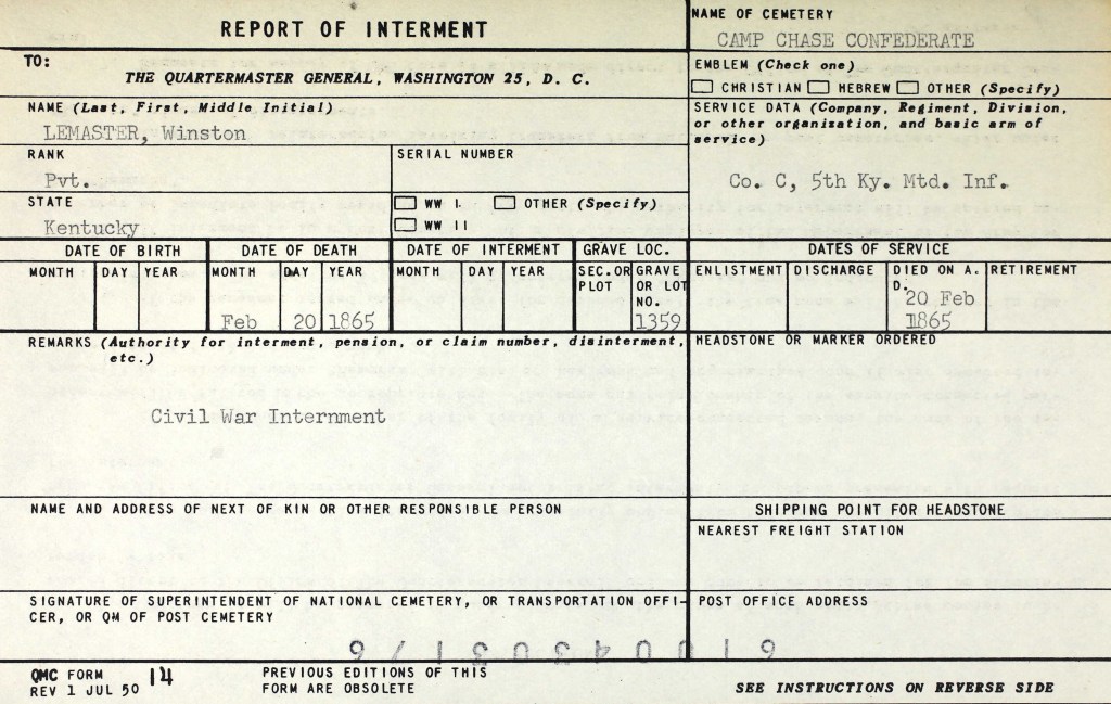 Buried on February 20, 1865, in the Camp Chase Confederate Cemetery at Columbus in Franklin County, Ohio, in grave number 1359.