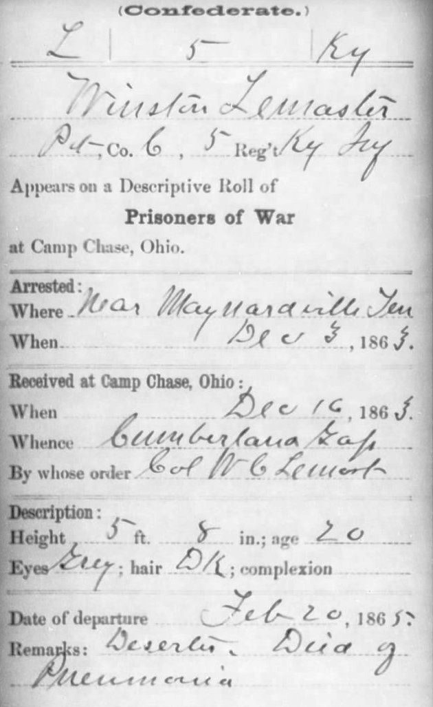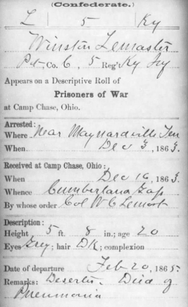 Captured: 1863, December 3 at Maynardville, Union County, Tennessee (another source states he was captured in Anderson County, Tennessee)