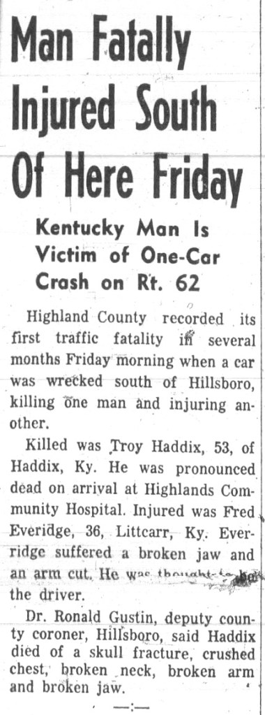 According to news reports, Troy Haddix and Fred Everidge of Littcarr, Kentucky, were traveling on Route 62 just south of Hillsboro in Highland County, Ohio. Speed may have played a factor, but Everidge, a coworker of Haddix, drove the vehicle off the roadway. Both men were seriously injured. Medical officials reported that Haddix was “dead upon arrival” at the Highland Community Hospital from injuries including a “skull fracture, crushed chest, broken neck, broken arm, and broken jaw.” Everidge received a broken jaw. Troy Haddix was 53.