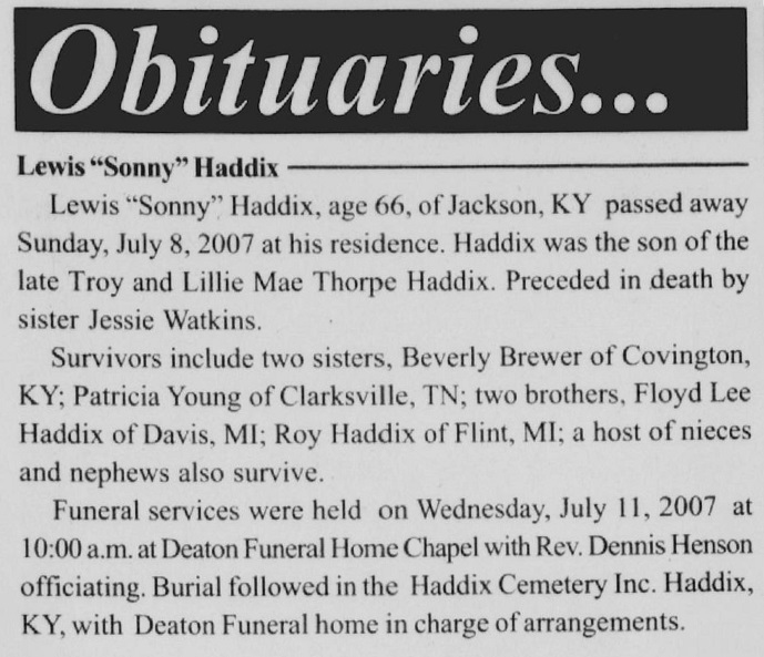 On the morning of July 8, 2007, his niece, Kay Gross, went in to wake Sonny for breakfast, but he did not respond. During the night, a heart attack had claimed Lewis “Sonny” Haddix. He was 66.