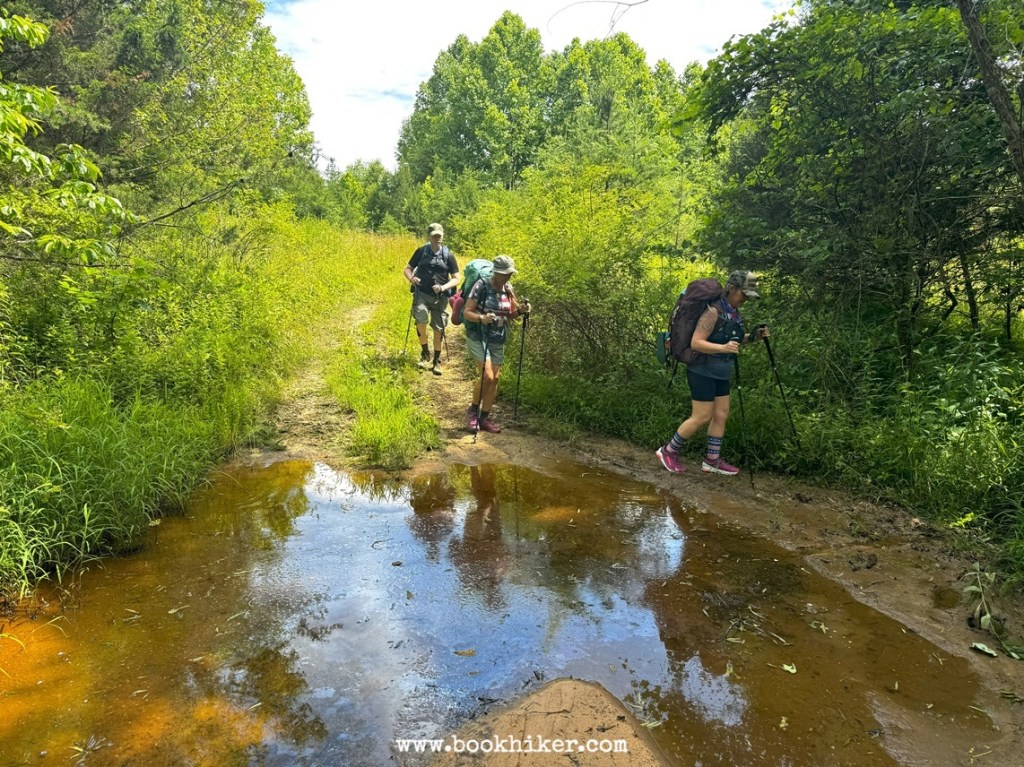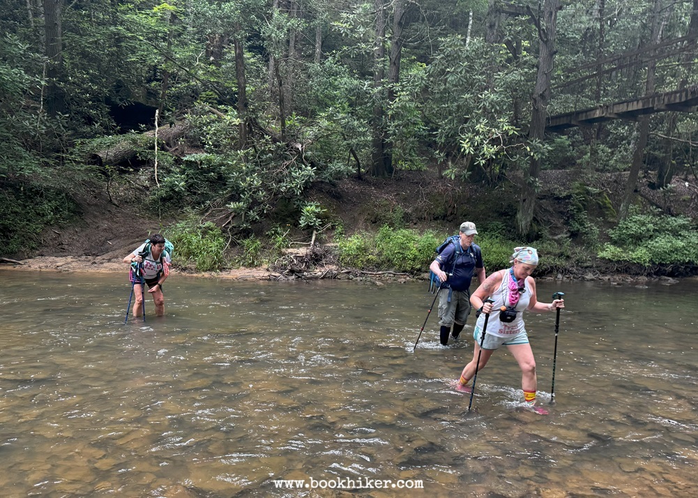 After a good night’s sleep in the cool June air, it was up and out of camp by 6:00 a.m. and over to Pine Creek Church and the cemetery. We arrived too late to see the light show. Then, we hiked down to Sinking Creek and through the river crossing there. Several in our group chose to look closer at the ground by getting up close and personal, thanks primarily to the work of an unnamed “serial pusher” who crept up behind hikers to practice her art. We even had a “Karen” who constantly yelled for us to get the manager.