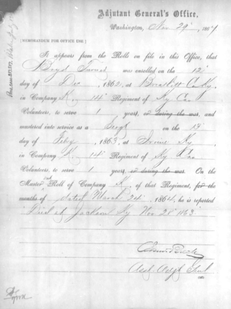Died on November 28, 1863, at the regimental hospital in Jackson, Breathitt County, Kentucky, of jaundice (an alternative date of 1863, December 9, is also contained in the records).1