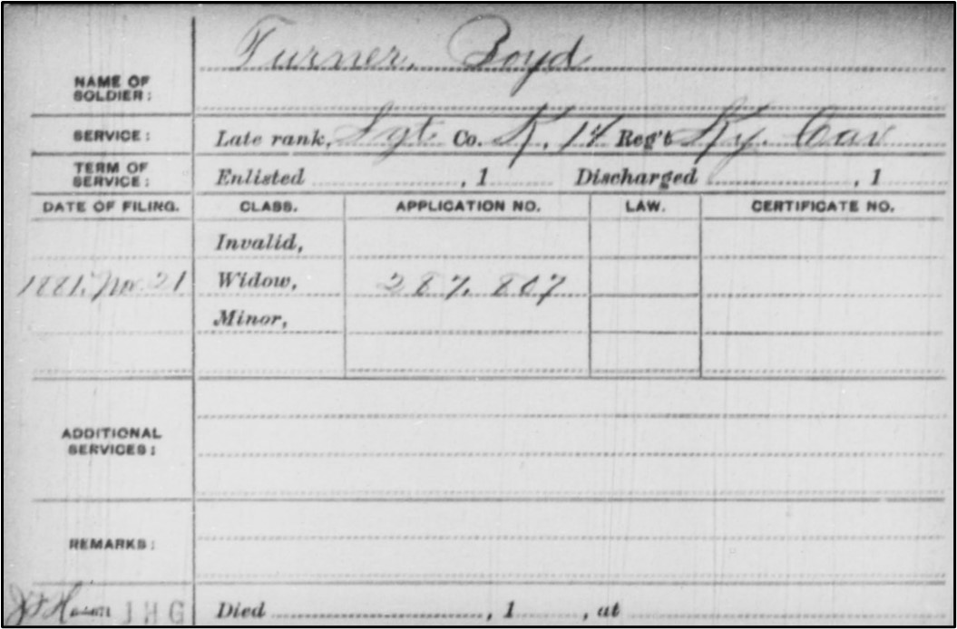 The following pension was falsified and created by Alfred Little as part of his massive pension scheme in 1884-1885 to defraud the United States Government. Boyd Turner was never married. The Pension Board did not issue a Widow’s Pension for an Elizabeth Turner. Alfred Little was subsequently convicted in Federal Court of fraud and imprisoned in Atlanta.