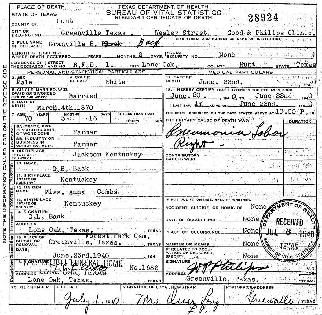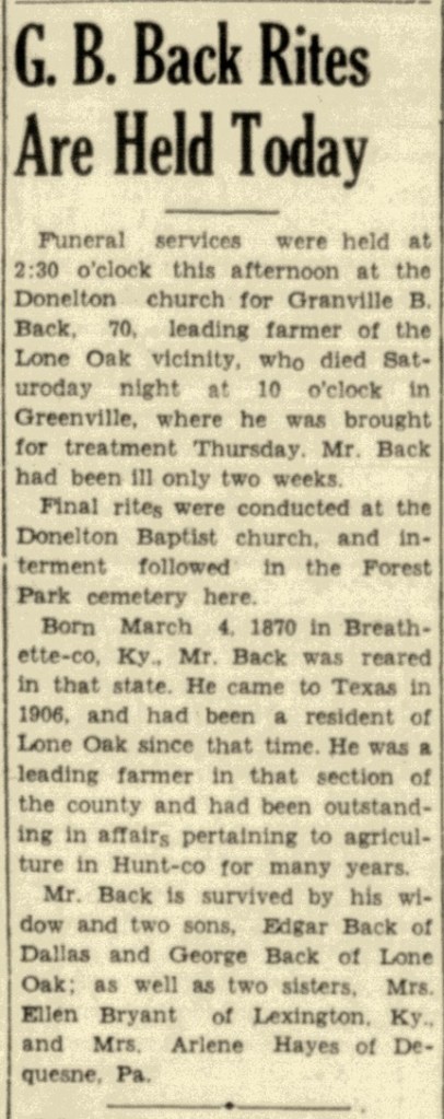 Granville B. Back, 70, a prominent farmer of the Lone Oak Community, died at 10 o’clock Saturday night, June 22, in Lone Oak, Texas, after an illness of only two weeks duration.