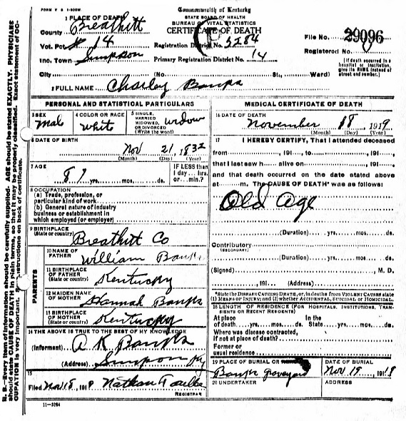 Buried – November 19, 1919, in the Charley Banks Cemetery on Reynold’s Fork at Simpson, Boone Fork of Frozen Creek, Breathitt County, Kentucky