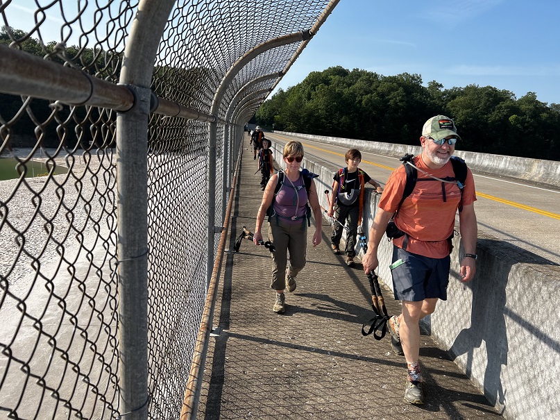 After crossing the top of Laurel Dam, hikers will pass a privy on the left at the top of the walk that leads down to the beach. Take advantage of this last pit stop until Mouth of Laurel. Just after passing the privy, the Sheltowee Trace crosses the Glen Elmo Cary Memorial Bridge. Constructed in 1987 by Elmo Greer and Sons, Inc., the Cary Bridge crosses over the dam’s emergency spillway.