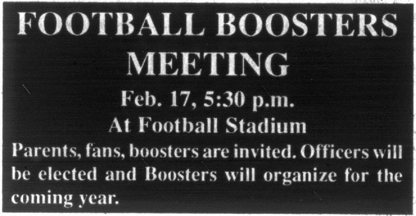 Football Boosters Treasurer Brenda Miller gave a financial report pointing out that the present “kitty” is meager. She stressed that there is some money to begin, but much more is needed.