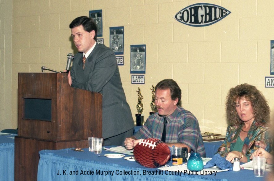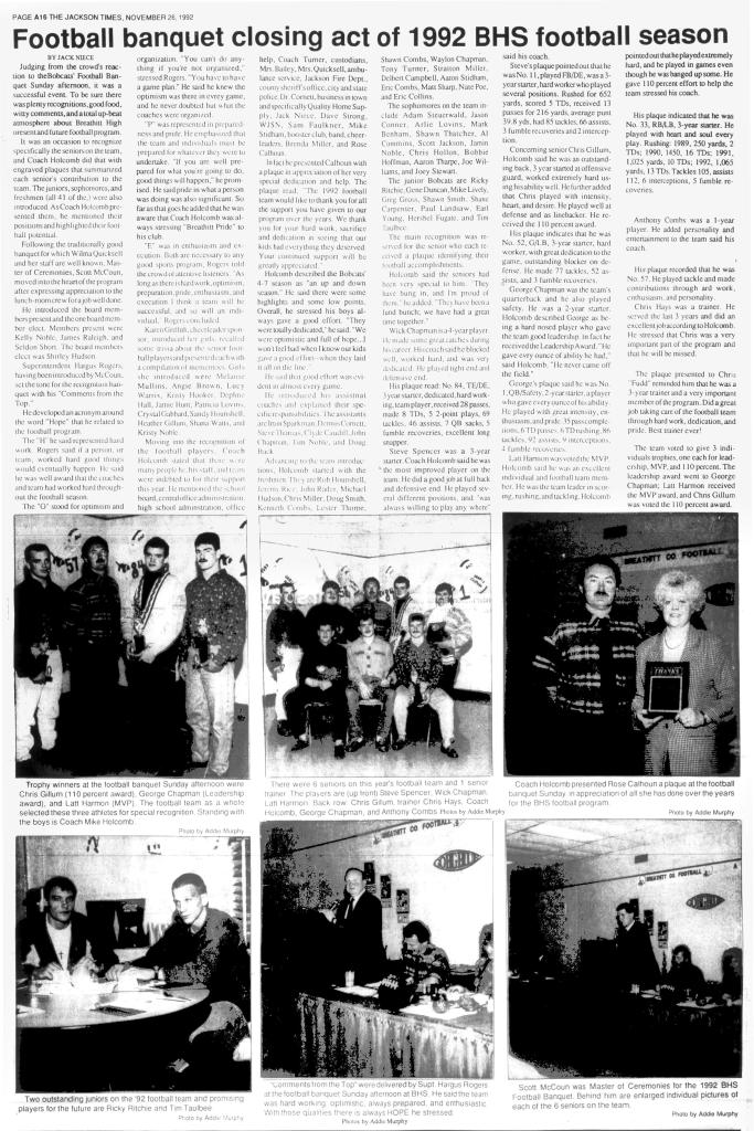 The Breathitt County Board of Education, Breathitt High School, Coach Mike Holcomb, and his staff held their 1992 Football Banquet at the BHS cafeteria Sunday afternoon. Before a packed audience, emcee Scott McCoun opened the ceremonies of the two-hour event at 1:30 p.m.