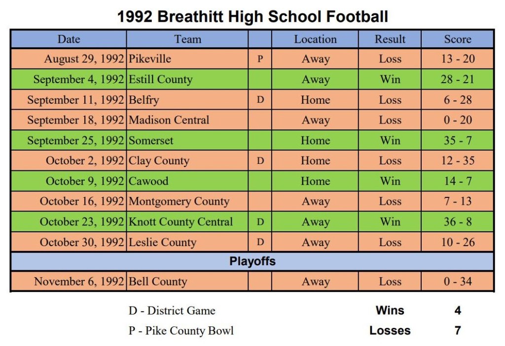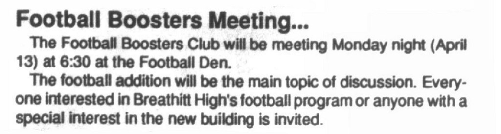 The annual announcement of the first Breathitt High School Football Boosters meeting was the unofficial start of every football season. The year 1992 was no different. The announcement appeared in the February 13 edition of The Jackson Times, and the meeting was set for February 17. Officer elections usually dominated the first meeting, but in 1992, there was something bigger ahead for the parent-based support group. Coach Holcomb and the Breathitt High School football team needed more room.