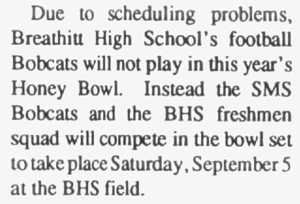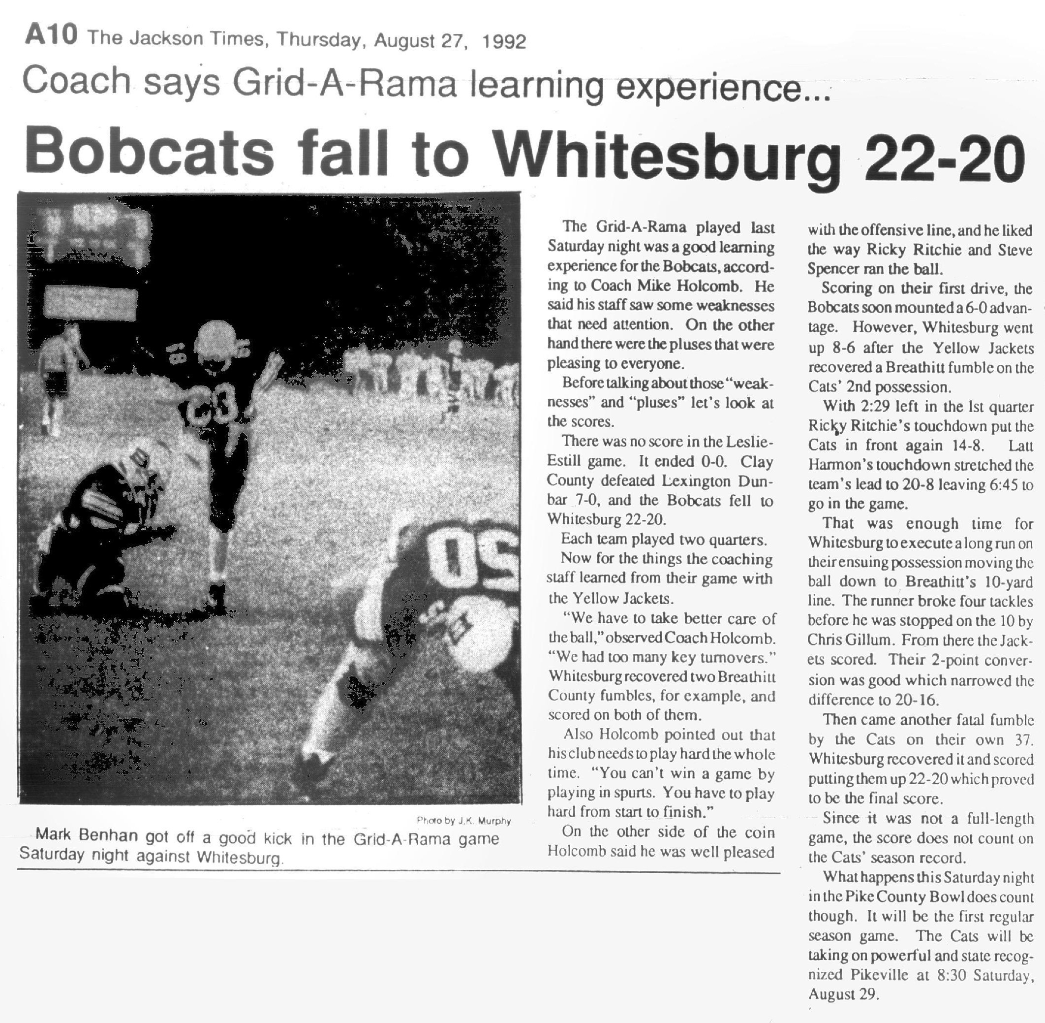 In the Breathitt-Bell game, the Bobcats had trouble generating much offense. In the first half, Latt Hannon rushed six times for 29 yards; Ricky Ritchie gained nine on five dashed, and Steve Spencer got six yards on three carries.