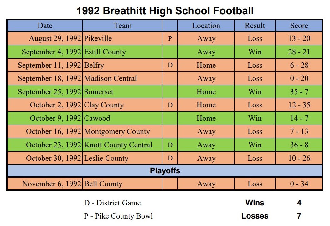 Bell County High School- November 6, 1992 – Loss 0 – 34