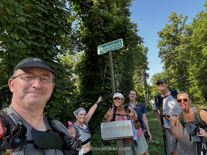 The fog that kept the morning temperatures pleasant was gone when we reached the base of Thunderstruck. The heat and humidity started to rapidly rise as we began our ascent. Up, up, and up to the intersection of Highway 700 and then a road walk down to Indian Creek. On the other side of Indian Creek, another climb awaited us. A few small patches of blackberries helped many fortify themselves for the steep uphill.