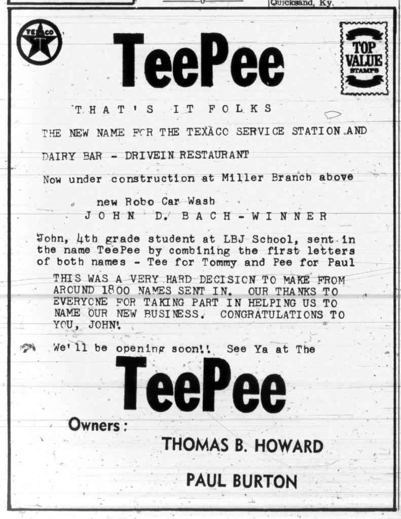 The popularity of the new eatery continued over the next few months. Tommy and Paul invited patrons to “fill up your car, fill up yourself” with some of our “deelishus TeePee Burgers.” The burgers became the staple meal, and customers from Breathitt County and many points south flocked to the diner to eat the famous burger. The new sign installed out front advertised the TeePee Burger, steaks, seafood, shakes, and fried chicken offered inside.