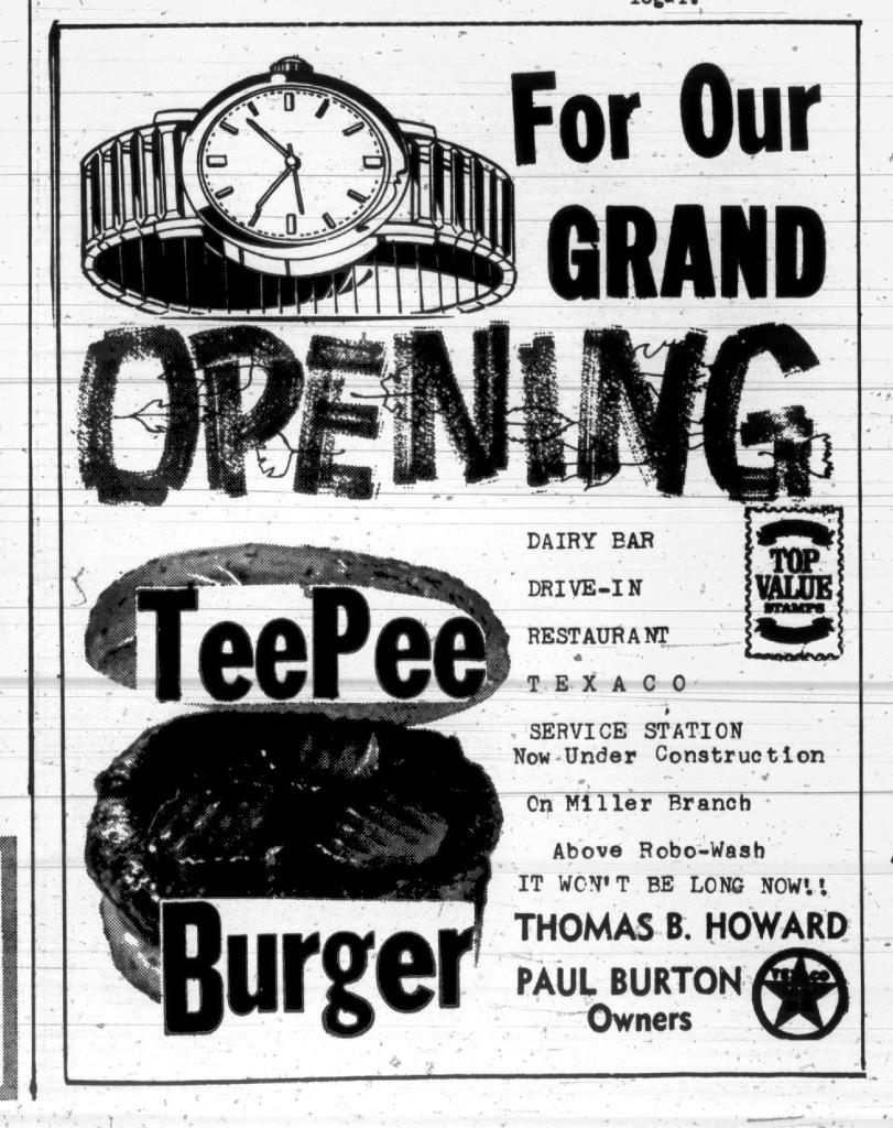 The construction was near completion when the last name suggestions were rolled in by the United States mail. The community submitted more than 1,800 entries. After a few days of consideration, Howard and Burton announced the business’s new name would be the “TeePee.” According to the advertisement in The Jackson Times, the name was suggested by John D. Bach, a fourth grader at LBJ Elementary, who developed the name by taking the “Tee” for Tommy and the “Pee” for Paul. At last, the new business had a name.