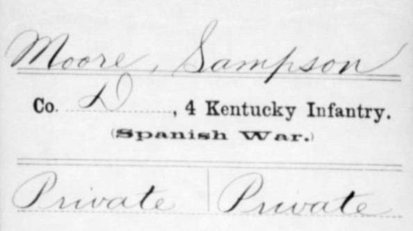 On April 9, 1956, at Huntington Veterans Hospital, Huntington, W. Va., death came to Sampson Moore of Whick, Breathitt County. Mr. Moore was a veteran of the Spanish-American War and was honorably discharged on July 4, 1902, having served three years. After his discharge, he was married to Miss Jane Spicer, who died in 1948.