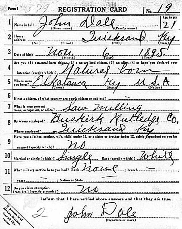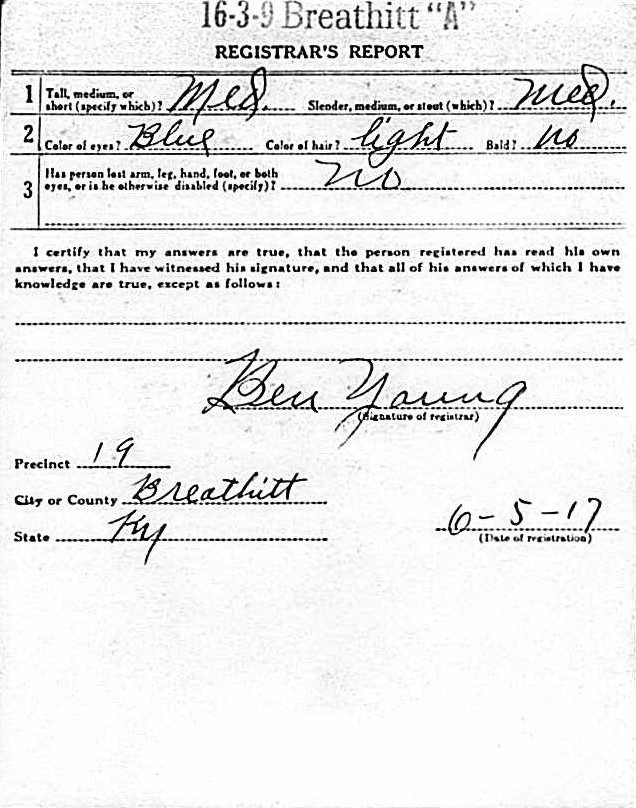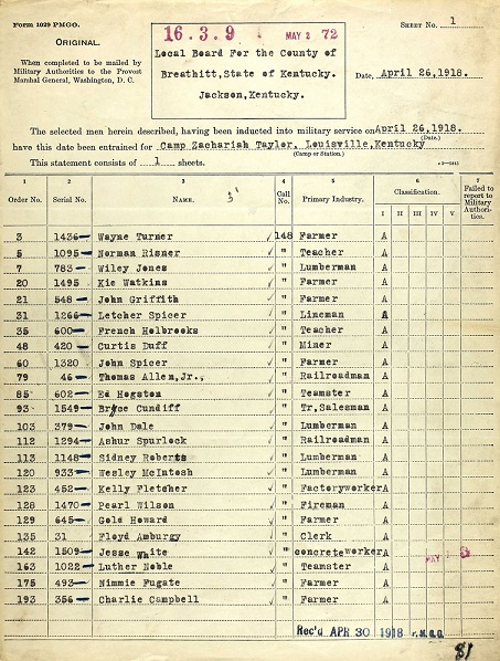 Drafted in April 1918 under Draft Call Number 148 from the Provost Marshal General’s Office in Washington, D.C., with twenty-four other Breathitt County men. Ordered to report to Louisville on April 26, 1918.