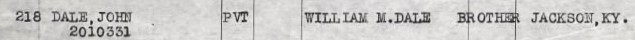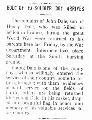 Shipped by rail from Hoboken, New Jersey, to Henry P. Dale at Jackson, Kentucky, on August 15, 1921. His flag-draped coffin arrived at Jackson on August 18, 1921, and was claimed by the family on Friday, August 19, 1921.