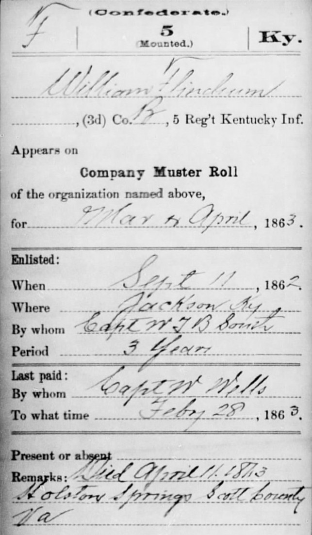 Enlisted: 1862, September 11 at Jackson in Breathitt County, Kentucky by Captain Willam T. B. South for three years.