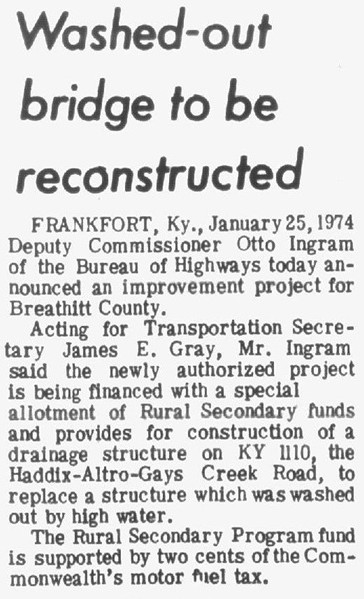On January 25, 1974, Kentucky Department of Highways Deputy Commissioner Otto Ingram announced that an allotment from the Rural Secondary Road Fund had been awarded to reconstruct the damaged section of the roadway. The funds, available because of a 2-cent tax on fuel, would help fix the washed-away section and bring the dip up to a flat level.