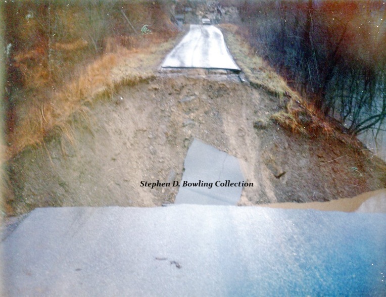 A driver headed to Jackson early on the morning of January 11 made it past the highwaters at Howard’s Creek and headed north toward Highway 15. He made it about a mile when he was stopped in his tracks near a spot where the roadway crossed near the mouth of a deep creek. There before him lay an open crevasse where Highway 1110 once lay. A huge section of highway was missing about a mile south of Dry Bread Hill. He stopped several other vehicles as they approached the chasm.