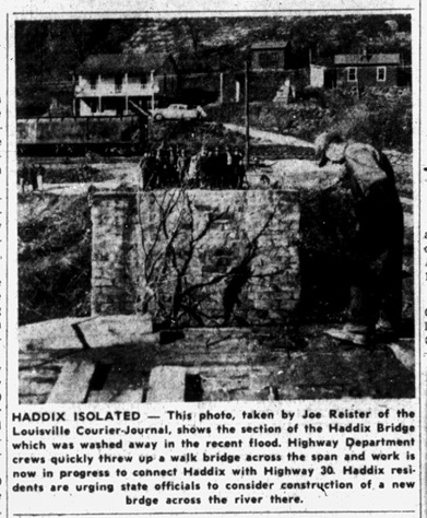 On January 30, 1957, the North Fork of the Kentucky River reached 40.41 feet and flooded many homes in Breathitt County. Statewide, thousands were homeless, and at least eleven were killed. Hazard suffered record-setting flooding, but in Jackson, the waters spared much of the town. The largest casualty of the 1957 flood in Breathitt County was the vital connection bridge between Highway 15 and the community of Haddix.