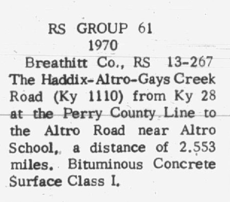The KDOH advertised for new road construction and improvements to rebuild and reroute the network of county roadways that led south from Haddix. The state proposed and funded a new roadway, the Haddix-Altro-Gays Creek Road, and awarded the first bid for construction in 1959. Construction crews built 8.717 miles of roadway from the end of the Haddix Bridge to Whick. The road was extended in 1963, 1966, 1968, 1970, and 1972, and the Department of Highways approved a series of small contract bids. When completed, the 15.6-mile road was redesignated as Kentucky Highway 1110.