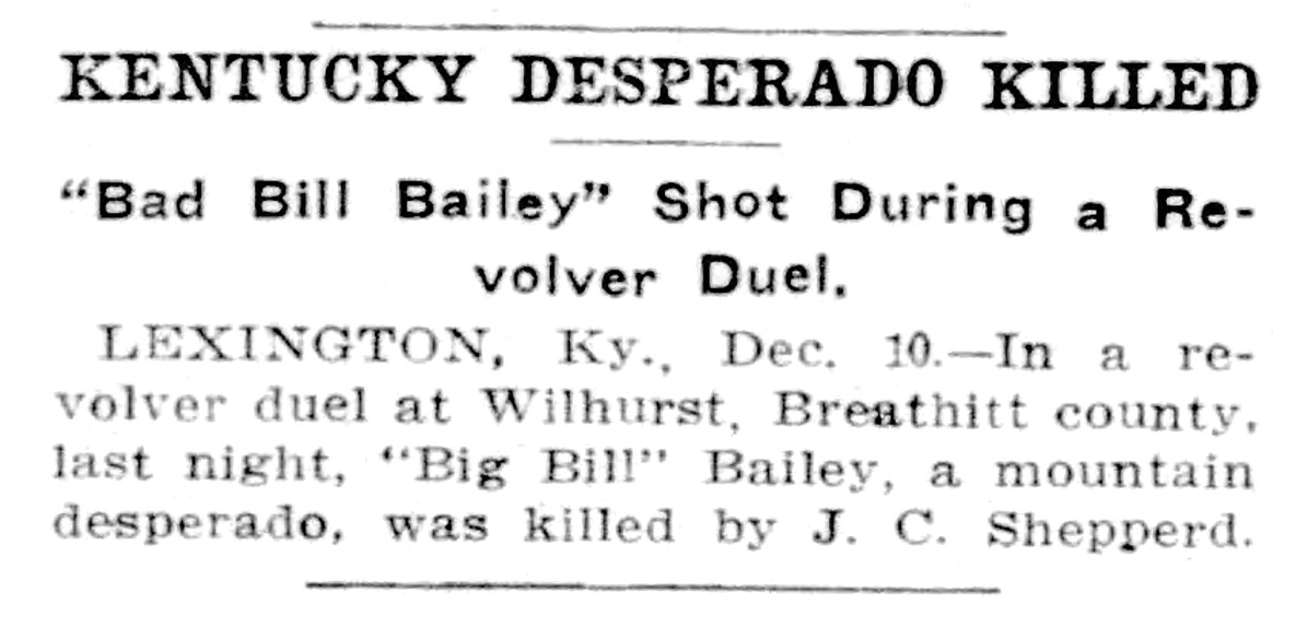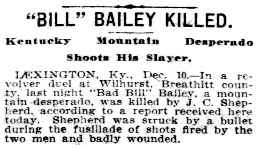 The “bad man” is a sorry figure in contemporary life. As an example of the ill effect of petty vanity and a consuming love of strutting for a little hour or two, the lion of a piece played before a small audience is without a peer. The list of the deluded individuals who have followed the ignis fatuus of bailiwick fame for badness in Breathitt is long. The lives of the majority have been short. Their exploits have been uninspiring. Their end has been ignominious, but history has not recorded the finish of one who died more ingloriously than “Bill Bailey,” who was extremely unpopular in the community in which he lived.