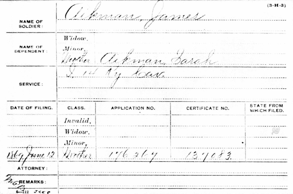 Sarah (Marsham) Akemon filed for a Mother’s Pension in 1869. The Pension Bureau approved her application (Number 176.269) on June 12, 1869. She was awarded Certificate #137.083.