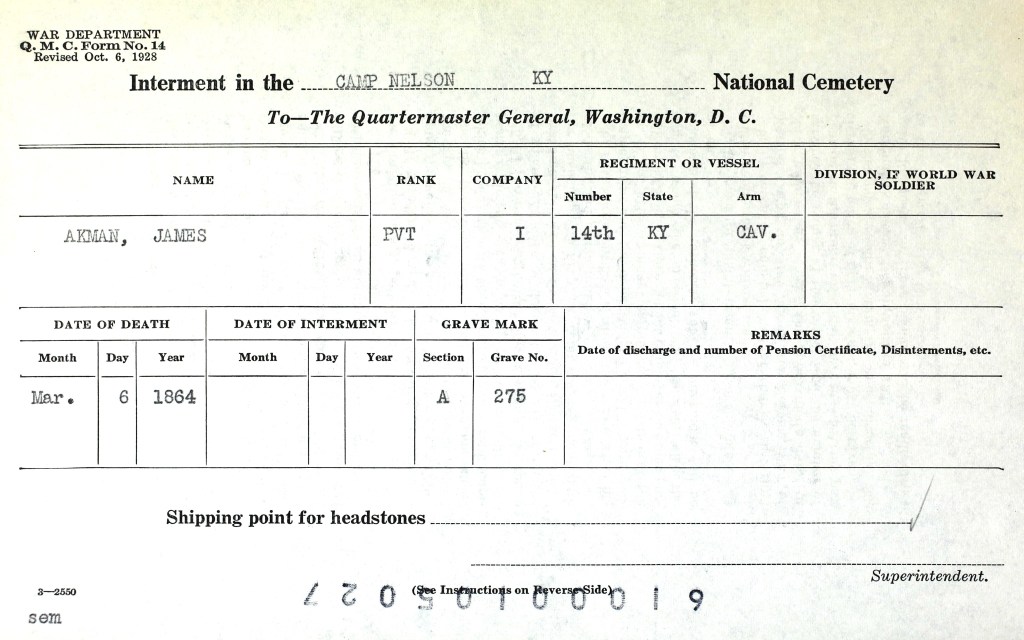 Buried on March 6, 1864, in Grave 275 of Section A at the Camp Nelson National Cemetery at Camp Nelson in Jessamine County, Kentucky.