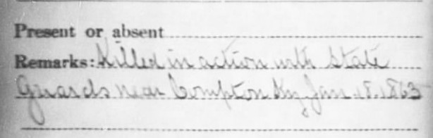 Died on January 18, 1863, on Devil’s Creek in Wolfe County, Kentucky. Service record stated: “Killed in action with State Guards near Campton, Kentucky on January 18, 1863.”