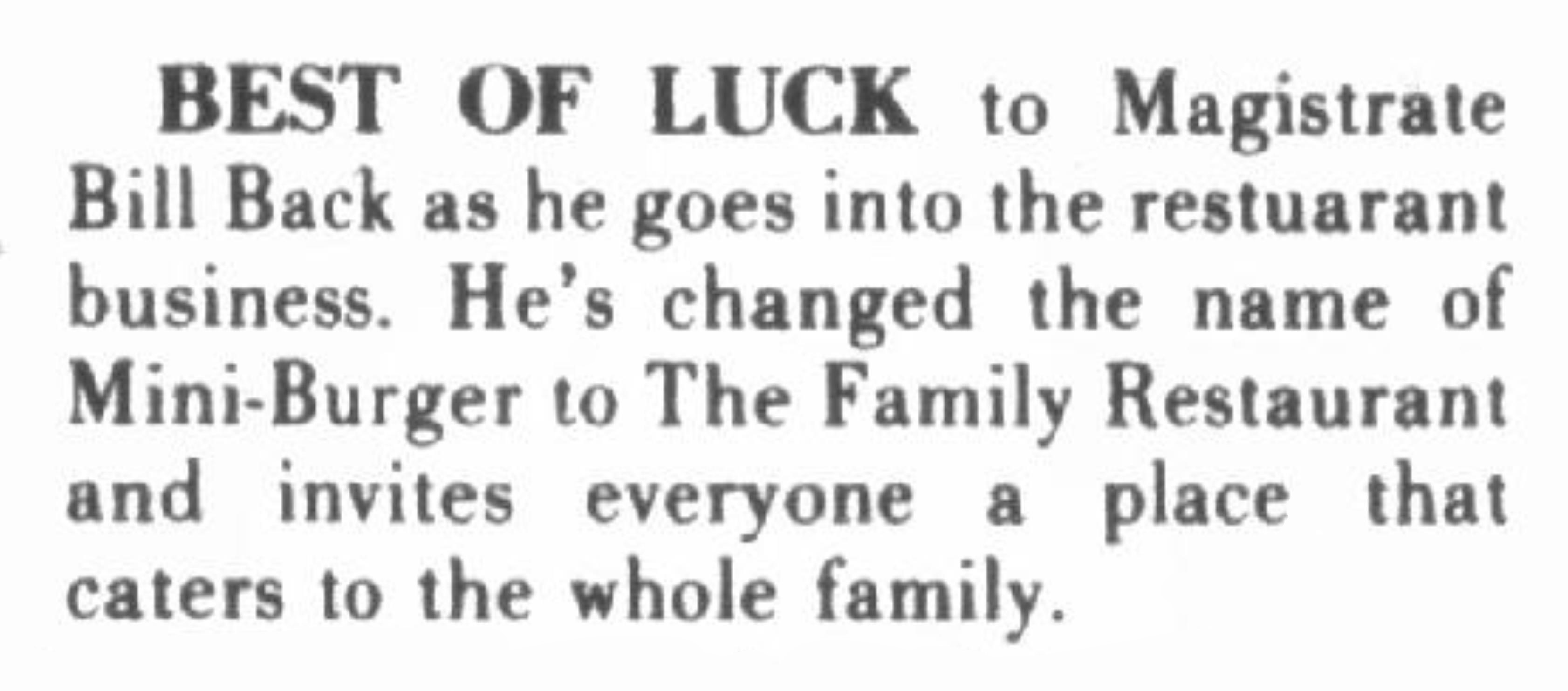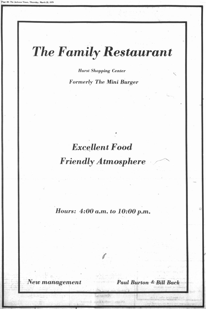 The Watkinses started negotiations with Magistrate William T. “Bill” Back and his business partner to purchase the lease of the Mini-Burger. An agreement was reached, and on March 18, 1979, Paul and Norma Watkins signed the lease for Bill Back and Paul Burton to take over the operation of The Mini-Burger. Louise Hatmaker, the editor of The Jackson Times, caught wind of the sale and broke the news of the transfer in her “Potpourri” column. Hatmaker reported that Back and Burton had purchased the lease and would change the business’s name to The Family Restaurant.
