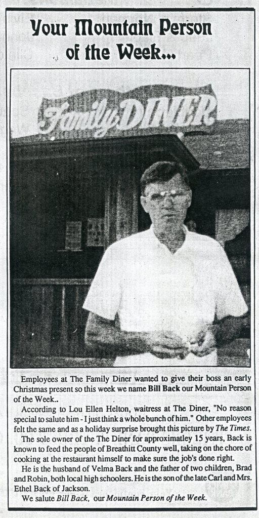 In August 2004, the Family Diner marked its 25th anniversary, and The Breathitt County Voice printed a feature article about the anniversary. Back thanked all those who had worked for him during the years. He expressed his appreciation for the cooks, especially the waitresses, including Marlene Turner, Thelma Gross, Brenda Henson, Lou Helton, Alice McIntosh, Maxine Howard, and others.