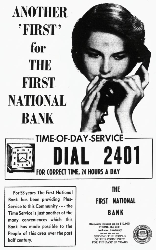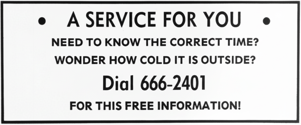 The new service was live on Monday, September 10, 1962, and a special advertisement in The Jackson Times announced the new number. Those seeking the “correct time” to set their mantle or pocket watches by could dial 2401 and listen to the automated time twenty-four hours a day. By 1964, the phone system required the addition of the 666 to the number as it expanded and upgraded for long-distance calls without operator assistance.