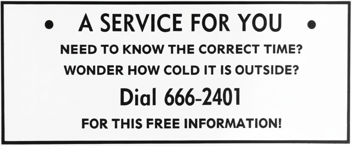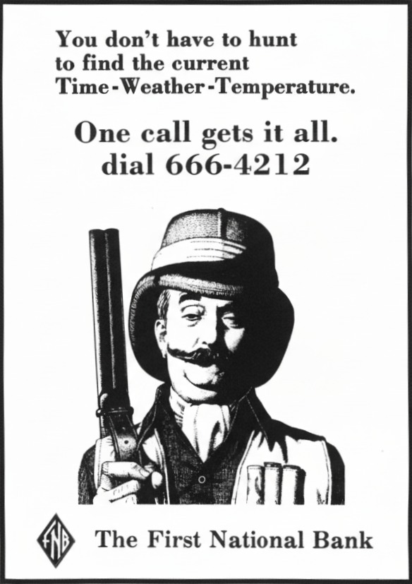 In 1983, First National Bank added a new feature to the popular local phone number. The new service added the current weather forecast to the time and temperature as presented by the voice on the line.
