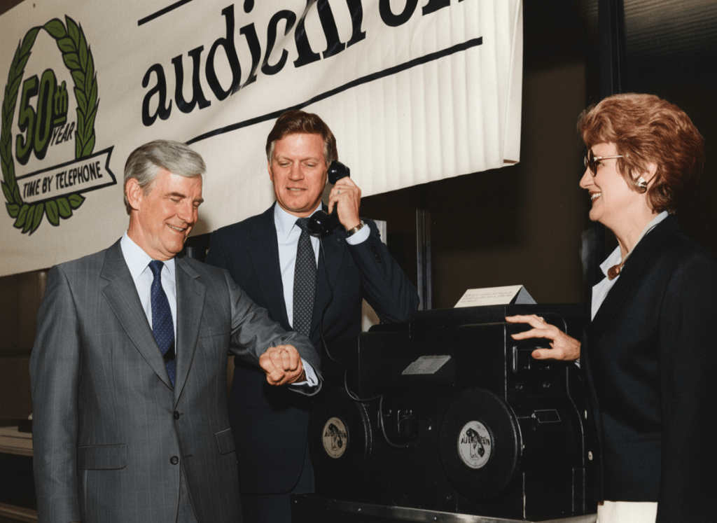 John Leonard Franklin invented the time management system using two 78 rpm records in 1931. The records contained a short “commercial message” and the accurate time. The popular service offered by businesses nationwide soon evolved with technology. A “solid state” version, also known as the “digital system,” was developed, and services were improved.