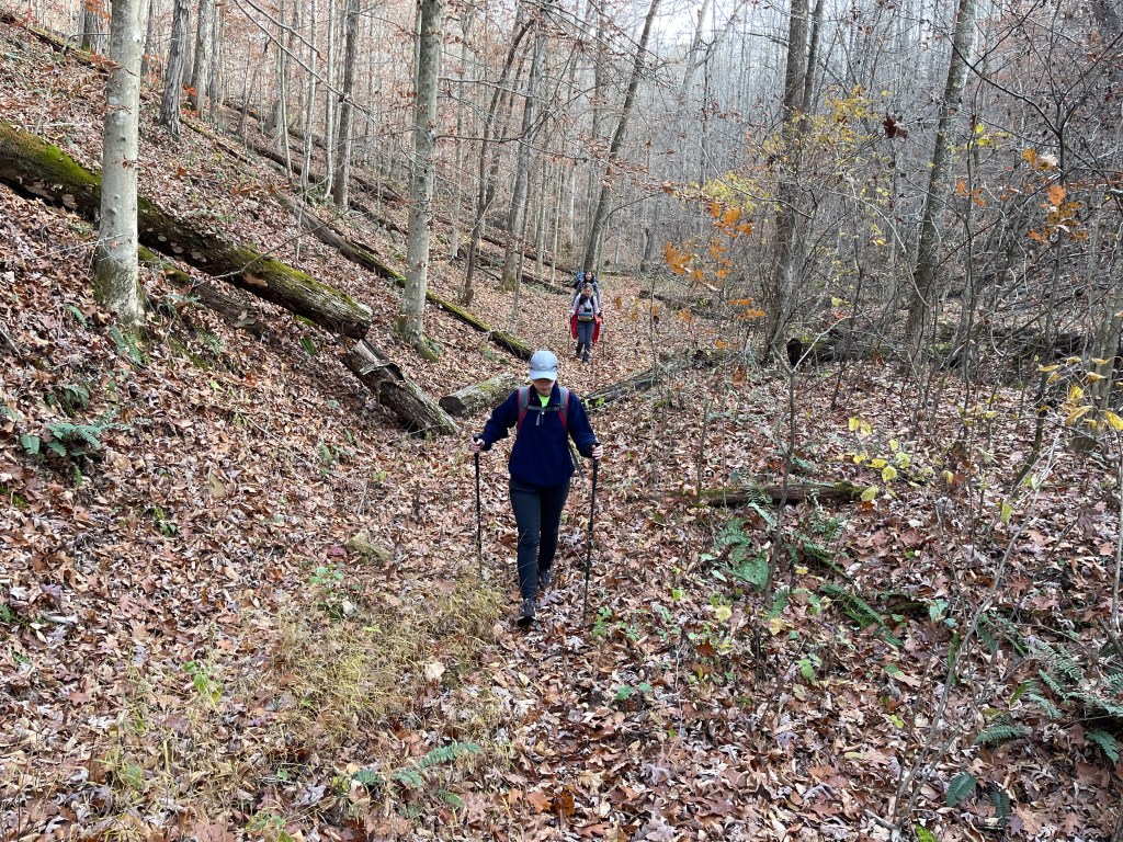 A large cut created by fast-moving waters and some severe trail erosion near the head of Big Tom Brown Branch caused a portion of the trail to become steep and dangerous. In 2023, the Cave Run Chapter and the Forest Service started an effort to relocate the trail. That completed reroute is open for “business” in 2024 and has added to the “elevated enjoyment” of hikers along this section. The second section of the reroute opened for use in November 2025 and eliminated more than two miles of gravel and asphalt walking at the top of the hill.