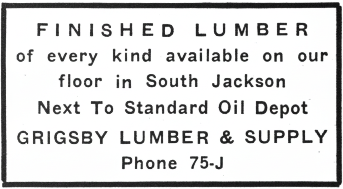 Johney Grigsby constructed an office and “wood yard” on Highway 15 about a mile and a half south of Jackson, where he sold “lumber, rough and finished, for every building purpose.” At some point, they also had a “show floor” in South Jackson to sell finished lumber and planed molding in a building next to the Standard Oil Depot. Delivery was also an option for would-be lumber purchasers, and Grigsby freely advertised the number and reminded builders that they could be reached at “75-J.”