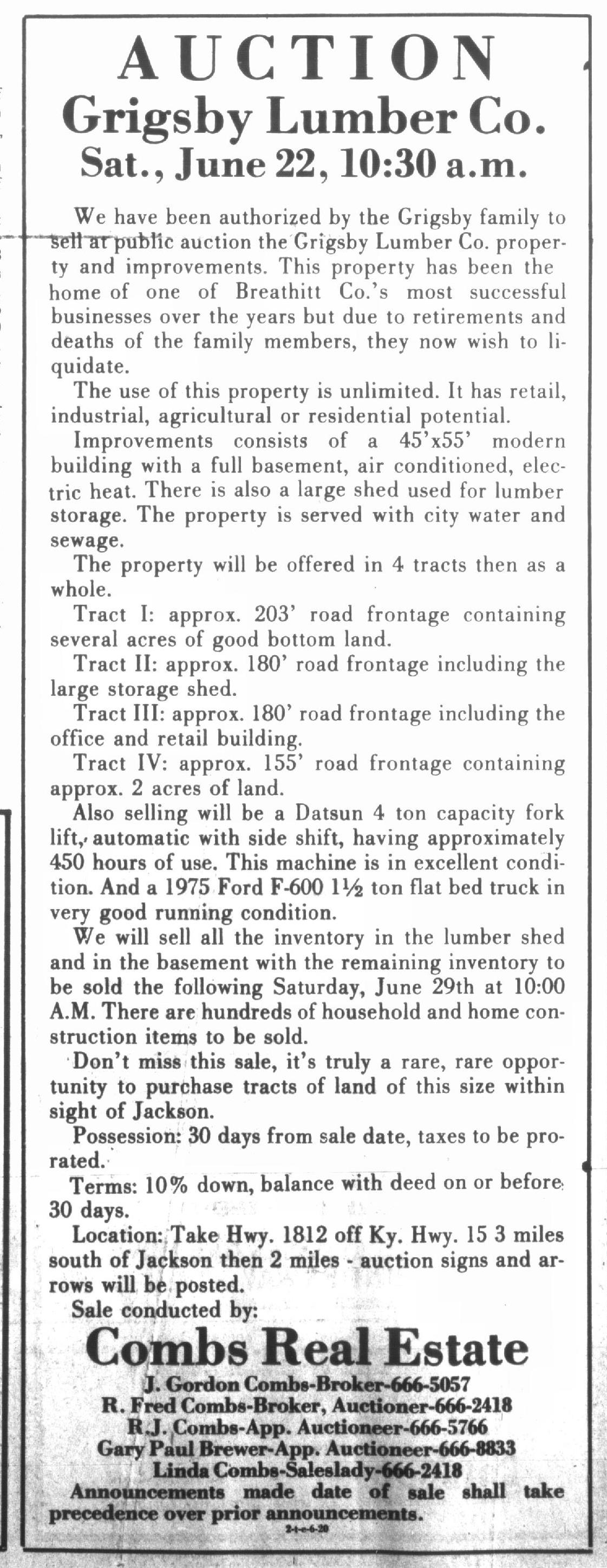 On June 22, 1985, Combs Real Estate Company of Jackson held an auction of the “Grigsby Lumber Company property and improvements” along with several vehicles and connected properties. The centerpiece of the sale was the 45 x 55 feet office building and its large, full basement.