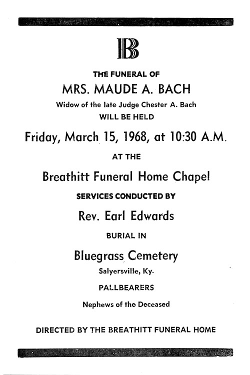 Funeral services for Maude Ella (Arnett) Bach were conducted on Friday, March 15, 1968, at the Breathitt Funeral Home. She was taken to the Bluegrass Cemetery in Salyersville, where they buried beside her husband.