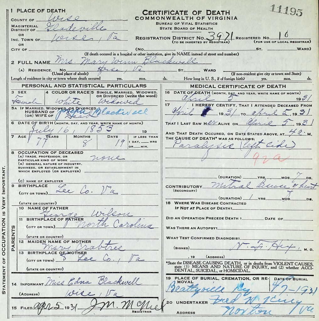 Mary (Wilson) Blackwell died April 5, 1931, at Gladeville in Wise County, Virginia