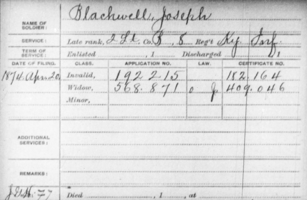 Enrolled: 1861, September 23, at Estill Springs in Irvine, Estill County, Kentucky, for three years