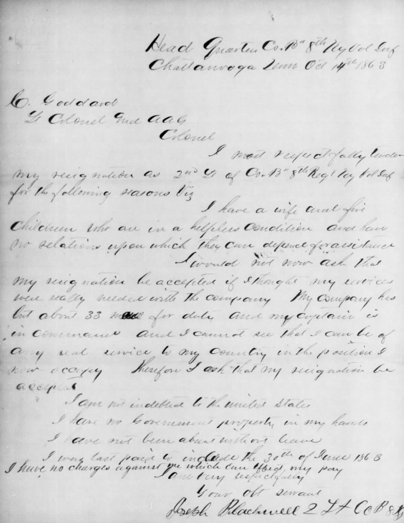 Resigned: 1863, October 22, at Chattanooga in Hamilton County, Tennessee due to family hardships