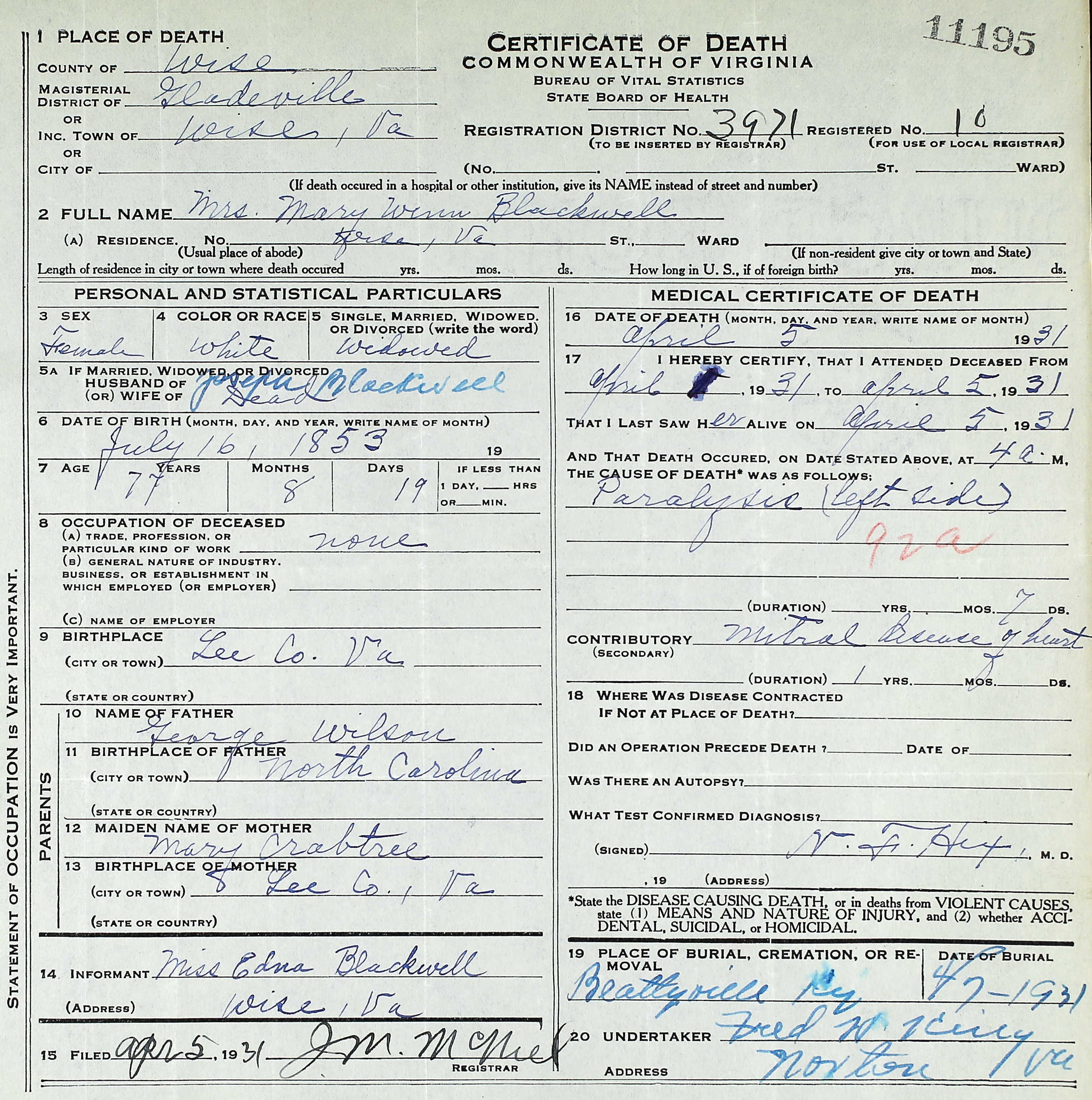 Mary (Wilson) Blackwell died April 5, 1931, at Gladeville in Wise County, Virginia