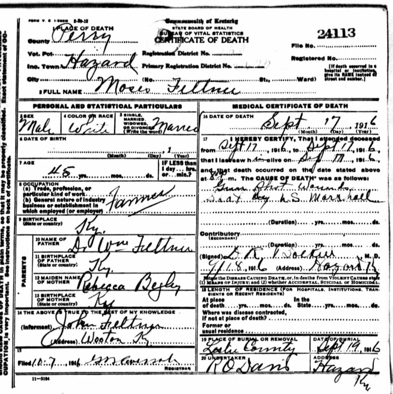 Mose Begley Feltner was taken from Hazard to his home near Avawam, Kentucky. The next day, he was buried in the Lewis-Feltner Cemetery. He was 45.